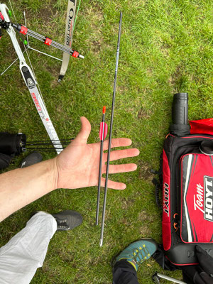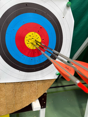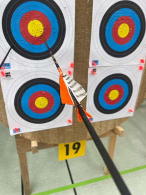 Am Sonntag startete der einzige erwachsene ABS'ler Gerd Güldenast in der Klasse Blankbogen Master. Ihm gelang ein ein ganz spezieller Treffer, siehe nebenstehendes Bild, indem er einen Pfeil direkt in den eigenen Pfeilschaft, der schon in der Scheibe steckte, schoss! Ein klassischer Robin-Hood-Schuss, der keine Bonuspunkte brachte, sondern zum Ringabzug führte. Korrektur: Beide Pfeile werden mit der gleichen Ringzahl gewertet! (Ein Dank an die aufmerksamen Regelexperten!) Seine Platzierung spielte am Ende des Tages eher eine untergeordnete Rolle, dafür war aber durchaus ein gewisser Lerneffekt vorhanden.
