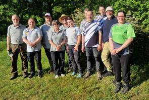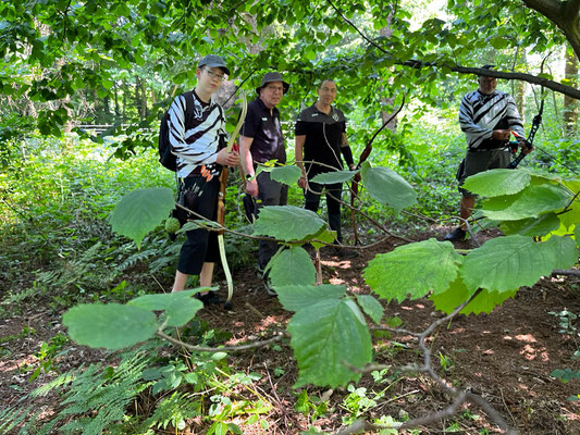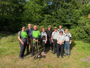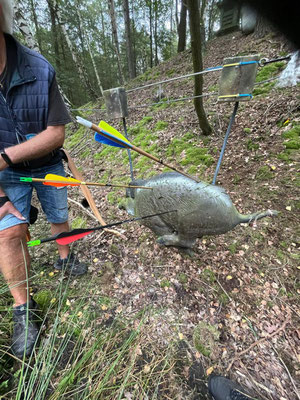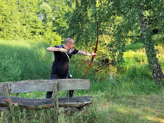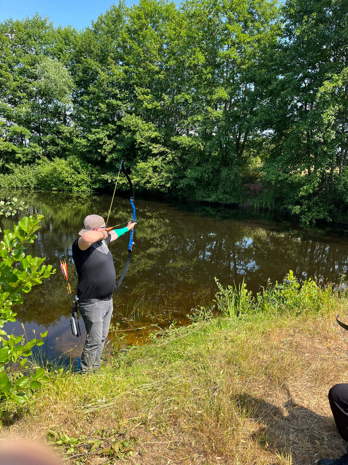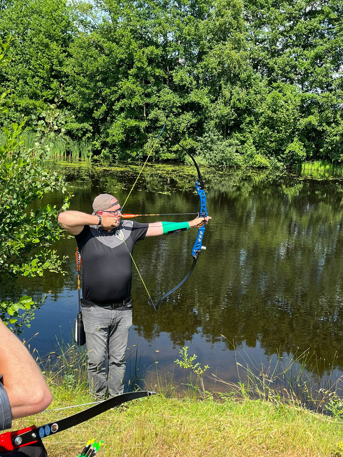 Und weiter geht es "Schuss auf Schuss" im Sportprogramm der Achimer Bogenschützen! Die Schatten der Pandemie sind mittlerweile verblasst und sowohl der Sommersonne als auch dem längst wieder regulären Betrieb des Meisterschafts- und Turniergeschehens gewichen! Zum wiederholten Male fuhren also wieder einmal drei "Jagd bereite" ABS'ler zum Gastgeber aus Oyten in Emtinghausen. Harald Hemmje, Mitglied der SSG Mühlentor-Oyten, stellte erneut sein privates "Schießgelände", inkl. fix und fertig aufgestelltem 3D-Parcour zur Verfügung! Ein dickes Dankeschön an dieser Stelle für die perfekte Ausrichtung und die freundliche Betreuung, bei der die übrigen Oytener maßgeblich mitgeholfen haben! In dem 2 ha großen Gelände (Naturgarten) waren zwar keine großen Märsche angesagt, dennoch bemerkten alle Teilnehmer*innen in der 2. Runde am späten, heißen Nachmittag eine gewisse Mattigkeit, wobei die Freude am schönen Schießerlebnis eindeutig überwog! 12 verschiedene Ziele, z.T. um einen großen Teich herum aufgestellt, wurden 2 x begangen, so dass jedes einzelne Tier aus 2 unterschiedlichen Entfernungen mit jeweils 2 Wertungspfeilen beschossen wurde. Vom Auerhahn über das Reh, den Fuchs, den Biber, den Hirsch und einen freundlichen Bären, sowie über weitere Tierarten landete man schlussendlich beim Wildschwein(chen). Für Ben Schmidt, dem einzigen offiziellen Starter dieser Kreismeisterschaft aus Achim, war der Tag zwar mit einer Menge "Lehrgeld" verbunden, aber dennoch erfolgreich, denn für den den Kreismeister in der Klasse Traditionelle Bogenschützen hat es ja gereicht! Vielleicht reichen die erzielten Punkte auch zur Qualifikation für die Landesmeisterschaft am 16.07 in Bockenem (Harz). Daumen drücken! Die beiden übrigen ABS'ler Gerd Güldenast und Raimond Ehrentraut starteten "ausser Konkurrenz", wie man so sagt "just for fun"! Bester Achimer war am Ende eindeutig Gerd, der mit dem TOP-Ergebnis von 352 Punkten in die Phalanx der sehr routinierten Oytener 3D-Schützen*innen einbrach und in der Klasse Blankbogen Master die zweitbeste Punktzahl erzielte! Anmerkung: Die Ergebnisliste folgt.