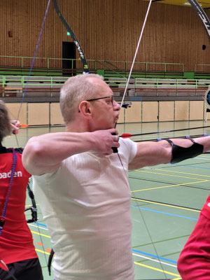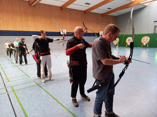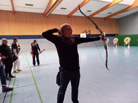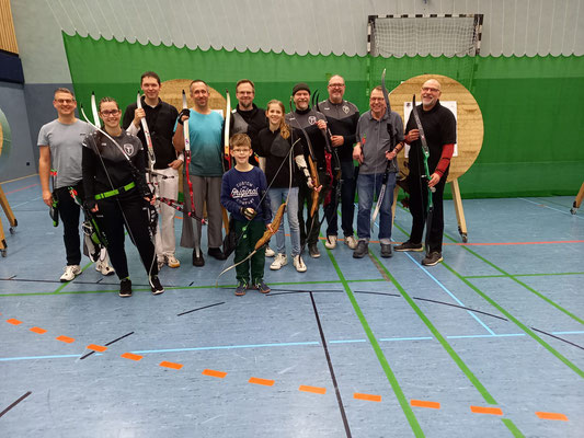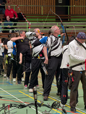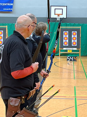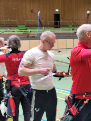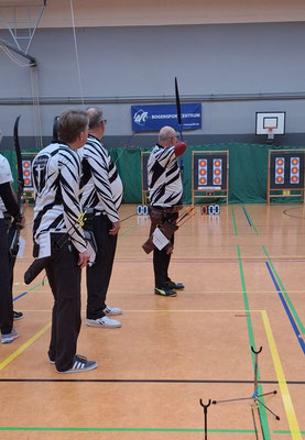 Die glorreichen Achimer 7 trafen sich zum letzten Hallenturnier der Saison in der Tarmstedter Schulhalle, 4 davon regulär angemeldet und 3 mit der Hoffnung auf einen Startplatz, obwohl das Event schon lange ausgebucht war. Da einige Angemeldete krank ausfielen, konnten Janusz Czermiak (Recurve Master) und Lutz Mecke (Blankbogen Herren) erstmalig an einem Turnier, quasi noch im Anfängerstatus befindlich, an den Start gehen. Und obwohl Lutz mit komplett neuem Schießmaterial auf große Entfernung noch nie geschossen hatte, erreichte er überraschend den 3. Platz in der Schützenklasse! Ebenfalls aufs Treppchen steigen, durften Finn Klenner, Platz 3 in der Klasse Blankbogen Schüler A, Gerd Güldenast bei den Mastern Blank, ebenfalls Platz 3 und herausragend mal wieder Thomas Asmuß mit dem Compound (649 Ringe!) auf Platz 2! Eine Anekdote am Rande: Den 3. unangemeldeten Startplatz erlangte Raimond Ehrentraut, dem allerdings als Blankbogenschütze nur ein Platz zwischen den Visierschützen mit der deutlich kleineren Auflage, 60 statt 80 cm Durchmesser blieb. Sein Ergebnis hätte auf der korrekten Scheibengröße rechnerisch vermutlich zum 1. oder 2. Platz gereicht. Hätte, hätte...Fahrrad....! ;-) Aber, wie heißt es doch, dabei sein ist alles! Das galt insbesondere auch für Natascha Wiesler, die krankheitsbedingt nicht schießen konnte, aber dafür dankenswerter Weise das Coaching der beiden Turnierneulinge übernahm! Fazit: Die Tarmstedter haben wieder einmal ein tolles Hallenturnier ausgerichtet, mit perfekten Bedingungen!