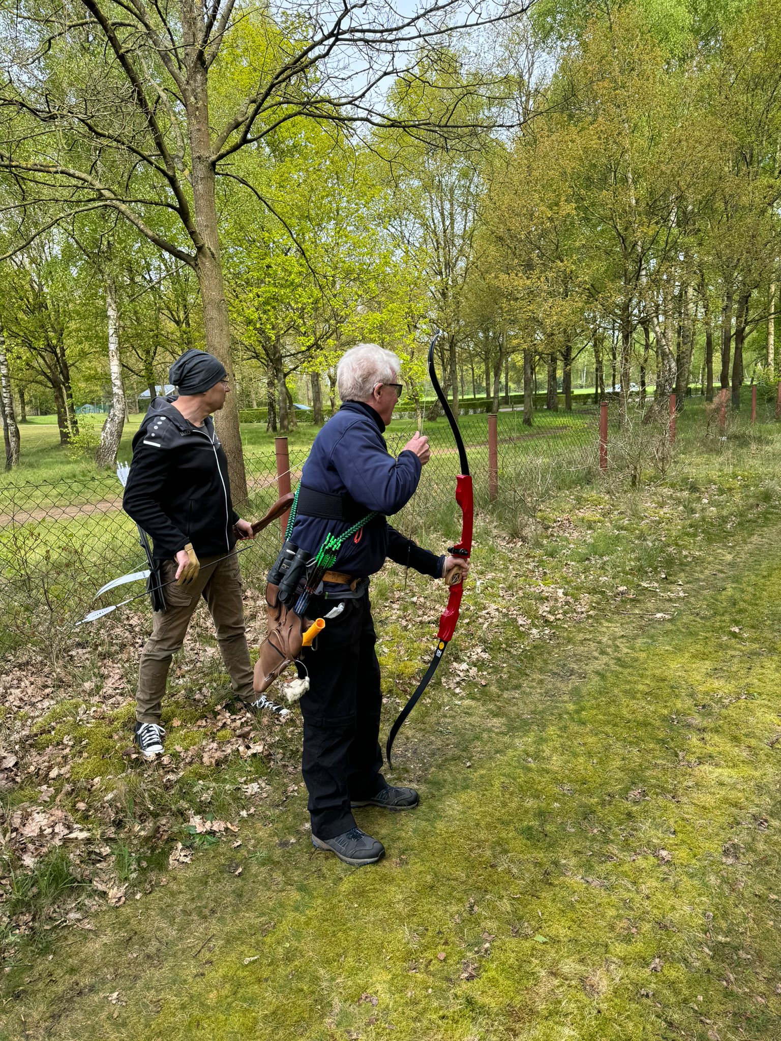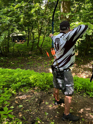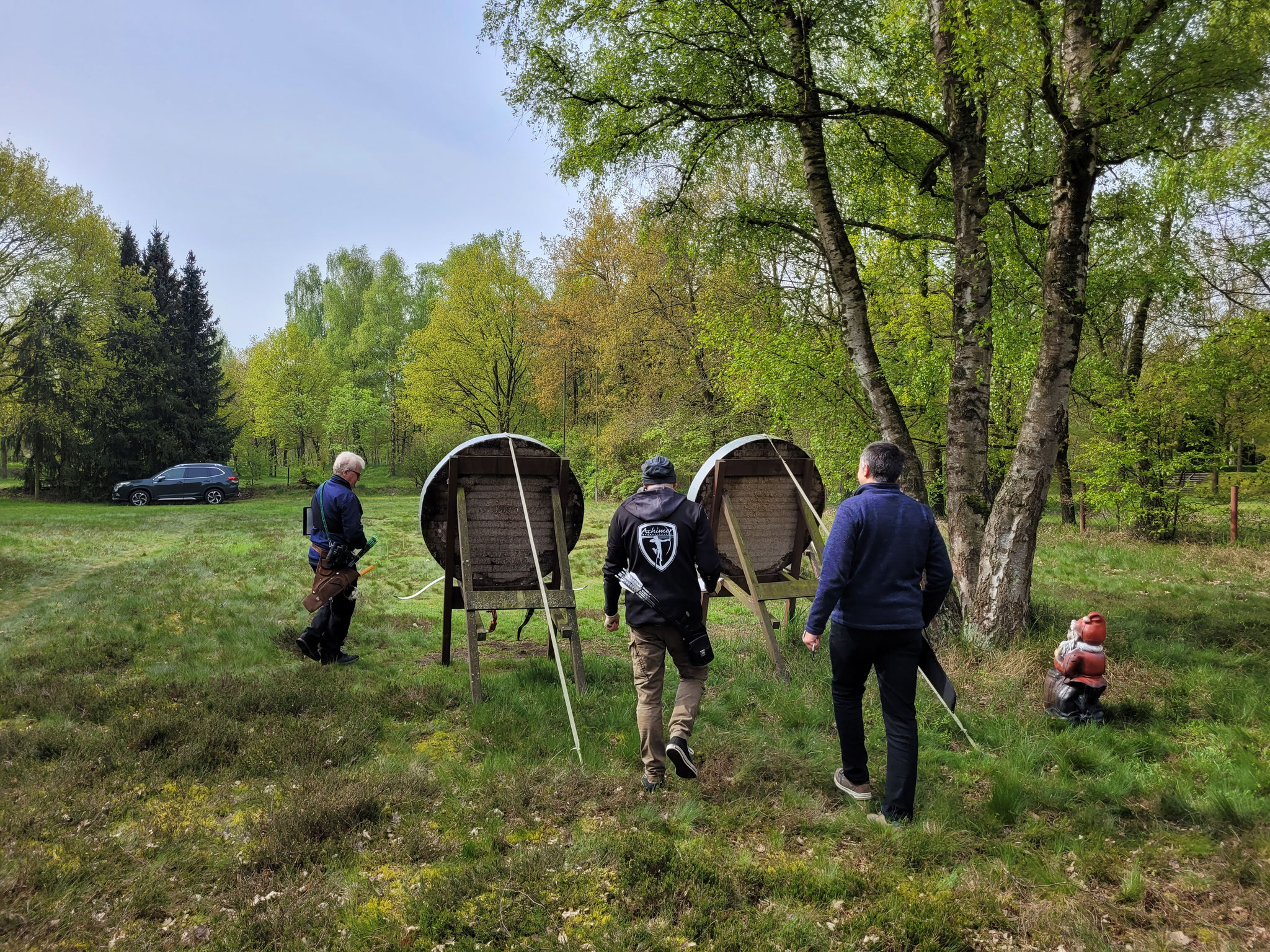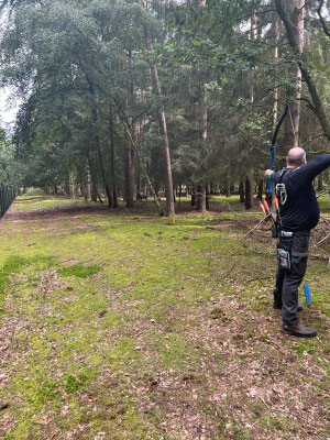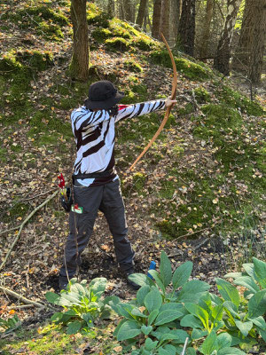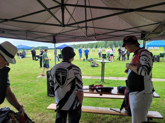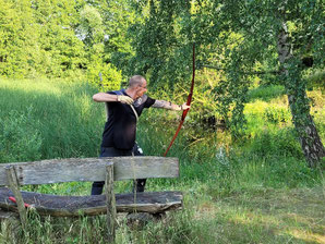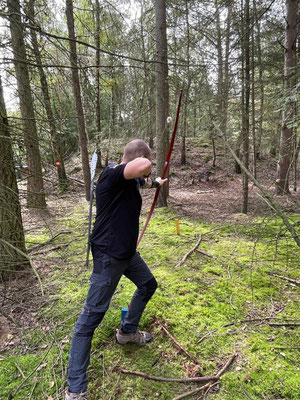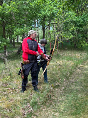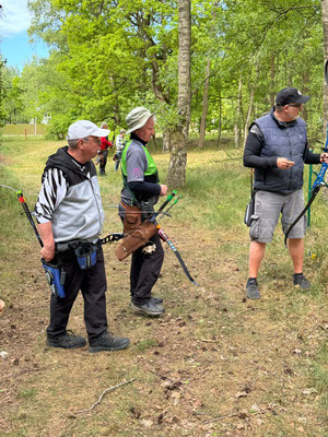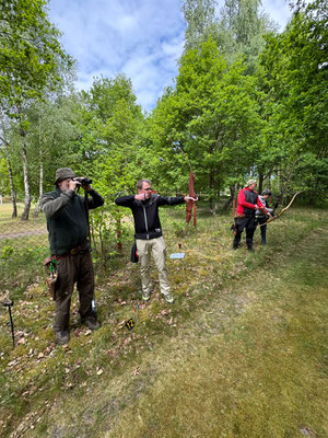 Die Achimer Teilnehmer: Gerd Güldenast und Raimond Ehrentraut - Blankbogen Master, Christian Steuer - Blankbogen Herren und Ben Schmidt - Langbogen. Im verkürzten Parcours wurde probiert und getestet. Stimmt die Technik, das Schätzen, der Instinkt? Gerade nach der langen Hallensaison braucht es schon eine gewisse Umgewöhnung auf das Schießen in der Natur, insbesondere in der "Königsdisziplin", dem Feldbogenschießen!