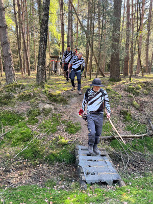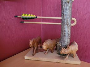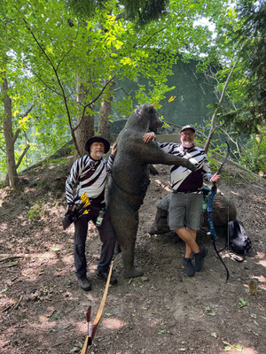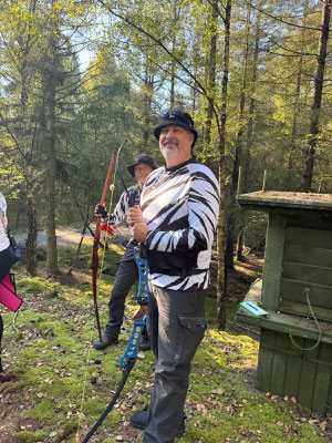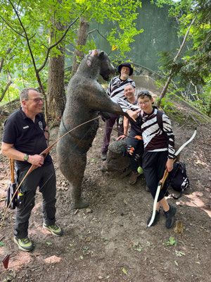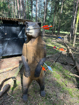 Eine Bärenhatz ohne Achimer Bogenschützen ist eigentlich kaum vorstellbar und so machte sich wieder einmal eine große Delegation von 3D-Enthusiasten aus Achim auf den Weg. Begleitet von herrlichem, sonnigen Wetter zog also eine wilde Horde jagdlustiger Zebras, ähnlich den griechischen Zentauren, durch den vielseitigen Parcours! Und sie jagten, angetrieben vom Heavy Metal - Adrenalin (Lied siehe unten) gar nicht mal so schlecht, nein - eigentlich sogar ganz gut! Gerd Güldenast, der nach langer Verletzung sehr spät in die Turniersaison eingestiegen ist, landete mit sehr guten 388 Punkten auf dem 7. Platz (25. Teilnehmer!) bei den Herren Blankbogen. Ben Schmidt belegte in der Klasse Langbogen glasbelegt mit starken 347 Punkten den 10. Platz (34 Teilnehmer!). In der gleichen Klasse gelang Jens Piehl ein guter Einstand als "Neuling", da er normaler Weise Blankbogen schießt. 292 Punkte und Platz 20! Thomas Asmuß hatte das Glück in der Klasse Compound unlimited einziger Starter zu sein und wurde somit automatisch 1. mit 355 Punkten.