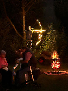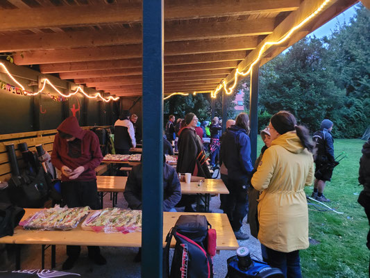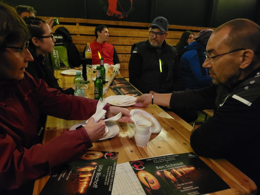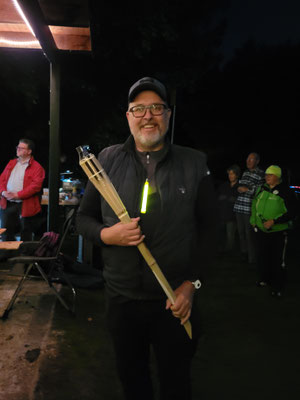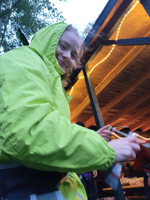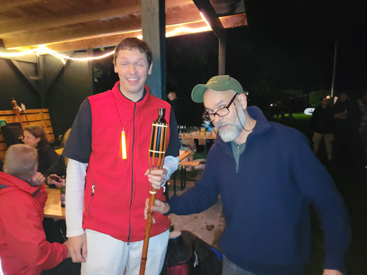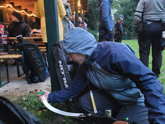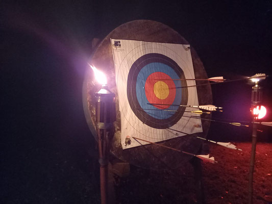 Alarmstufe Rot! Sturm und nicht enden wollender Regen machten aus dem geplant stimmungsvollen Bogenschießen im Fackelschein einen Survival-Kurs für Bogenschützen mit Katzenaugen oder Nachtsichtgerät. Nicht wenige Teilnehmer*innen sind aufgrund der sehr schlechten Witterung erst gar nicht angetreten. Aber, und das ist lobenswert, fünf hartgesottene Überlebenskünstler*innen aus Achim trotzten den Naturgewalten und zogen ihr Ding bis zum Ende, kurz vor Mitternacht, durch! Die Veranstalter hatten sich viel Mühe gegeben und versucht, das Beste trotz der widrigen Umstände zu machen! Das Catering mit belegten Brötchen und Warmgetränken war spitze, u.a. auch weil Vegetarier und Veganer zu ihrem Recht kamen.