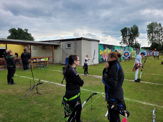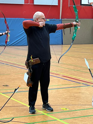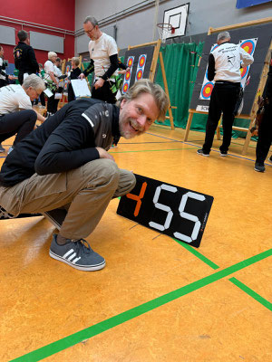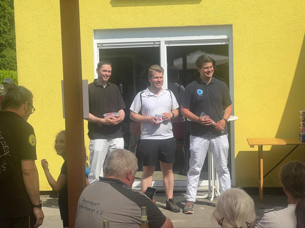 Sarah Kirchner mit 621 Ringen, von 720 möglichen! Klasse, gleichwohl sie selbst nicht ganz zufrieden war! Bei den Blankbogen Herren Master über 50 Meter Distanz gab es ein Kopf an Kopf-Schießen zwischen Andree Wilken und Raimond Ehrentraut, welches zugunsten des Erstgenannten ausfiel. Andree erreichte mit 11 Ringen Vorsprung 531 Ringe ein solides Ergebnis. In der Schützenklasse männlich versuchte Thomas auf 70 Meter seine Pfeile zentrumsnah unterzubringen, was ihm auch weitestgehend gelang: Schnappsige 444 RingeI sprangen dabei heraus! In der sogenannten 25 Meter-Schnupperklasse – für Einsteiger*innen bzw. Wiedereinsteigerinnen, die außerhalb der regulären Wettkampfklassen angetreten waren, belegte Anna den 3. Platz, Jens den 2. Platz und Urte Bischoff mit großem Vorsprung den 1. Platz!