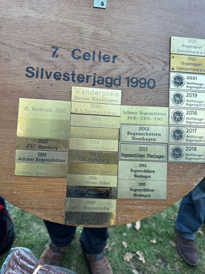 Wie Gerd zurecht feststellte, wäre es vielleicht mal wieder an der Zeit, dass wir die hölzerne Scheibe, den Wanderpokal für die beste Blankbogenmannschaft mal wieder nach Achim holen könnten! ;-) (Siehe Foto) Zuletzt gelang uns dies 3 x hintereinander von 2008 - 2010! Dafür müssen wir aber auch mindestens in Mannschaftsstärke auflaufen! Also ab damit auf die To-Do-Liste 2025!
