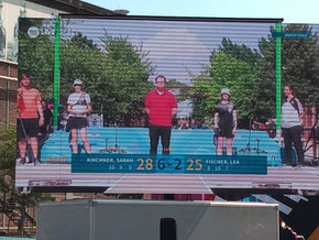 Sarah Kirchner, Kadermitglied des NSSV, nutzt derzeit jede gute Gelegenheit, sich kontinuierlich weiterzuentwickeln. So reiste sie am Sonntag gen Südwest nach Duisburg, um sich das erste Mal in einem Wettbewerb leistungsstarken Konkurrentinnen der Schülerklasse A im Duell zu stellen. Hierbei ist absolute Nervenstärke gefordert! Aus Sicht des interessierten Publikums ist das eine spannende Angelegenheit, die wie man auf dem Foto sieht, bei diesem Event sogar auf großen Monitoren live übertragen wurde. Zum Verlauf: Sarah setzte sich zunächst im Viertelfinale deutlich gegen ihre Kontrahentin durch, um dann im Halbfinale denkbar knapp den Einzug ins Goldfinale zu verpassen. Aber dann konnte sie sich noch einmal steigern und im Bronzefinale mit deutlichem Vorsprung den 3. Platz erkämpfen! Glückwunsch!